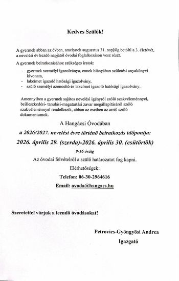 Helye: Hangácsi Óvoda (Hangács, Petőfi u.