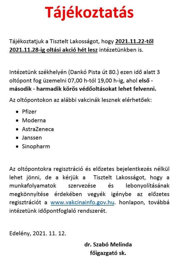 oltási akcióhét 2021. november 22. hétfő és